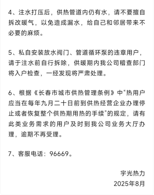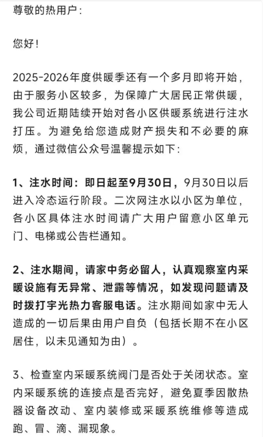 您好!2025—2026年的供暖期即将开始,为保障今冬供暖顺利进行,我们将未雨绸缪,提前排查并解决供热前可能出现的问题。同时,为避免提前打压试水给您造成财产损失和不必要的麻烦,现通过公众号温馨提示如下: