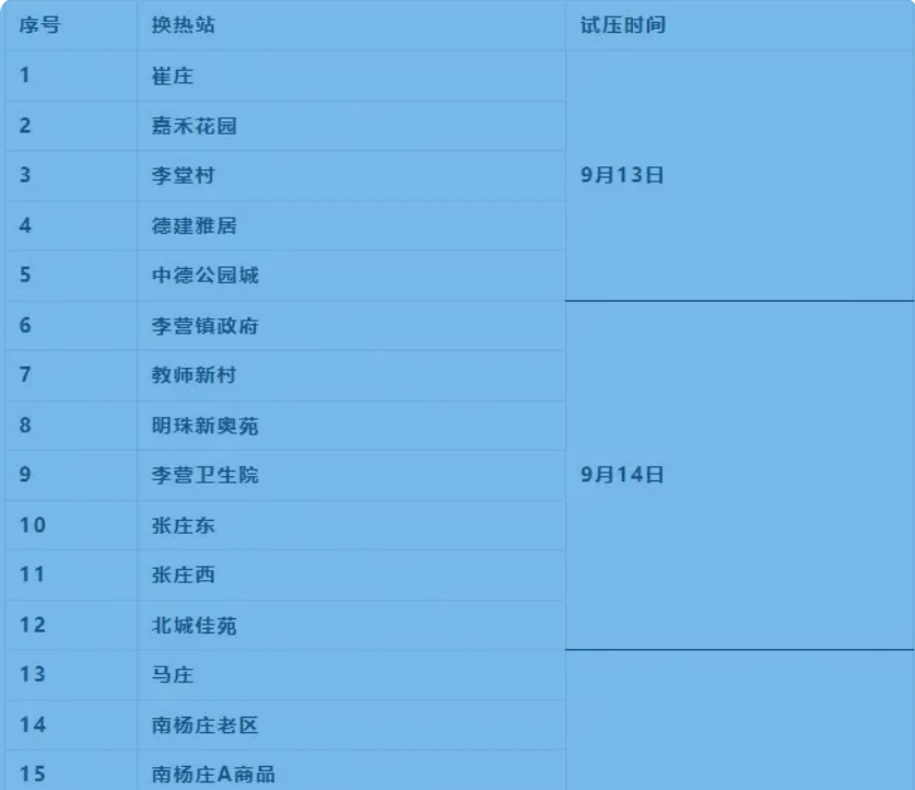 9月13日,运河热力公司将按如下计划对小区供热系统进行注水试压,请注意查看小区的具体试压时间,确保试压当天家中留人。试压完成后,供热系统即进入带压冷循环状态。请热用户不要随意改动、拆卸供热设施,以免发生漏水情况造成不必要的财物损失。试压期间,如遇紧急情况或公共区域漏水可拨打客服电话0537-2283828。