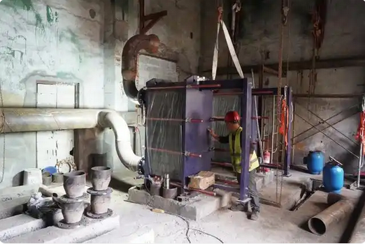 在西岗区锦济供热莲花锅炉房,施工人员正在安装设备建设新的换热站。