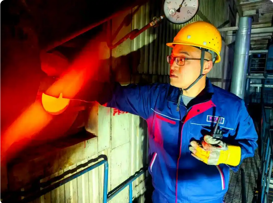 在热源厂内,两台大型锅炉正常运转,工作人员手持检测仪穿梭其间,逐一核对锅炉水位、炉膛温度等参数。
