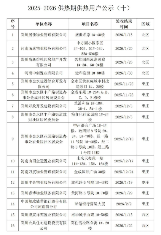 2月3日,记者从郑州热力集团有限公司了解到,该公司根据项目所在区域热源调度情况,按已公示用户工程验收合格名单先后时间排列,确定第十批用户,用热项目28个,报装用热建筑面积:247.98万平方米,到热力集团办结相关用热手续后,在2025-2026供热期予以供热。