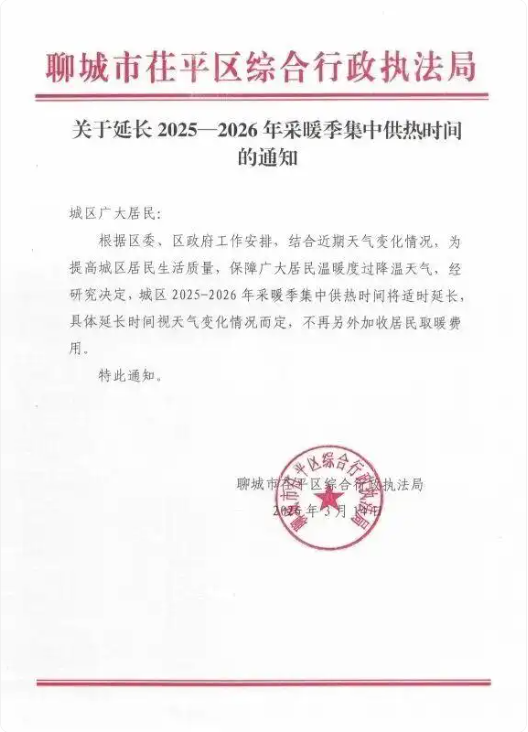 茌平3月14日,聊城市茌平区综合行政执法局发布《关于延长2025—2026年采暖季集中供热时间的通知》,全文如下: